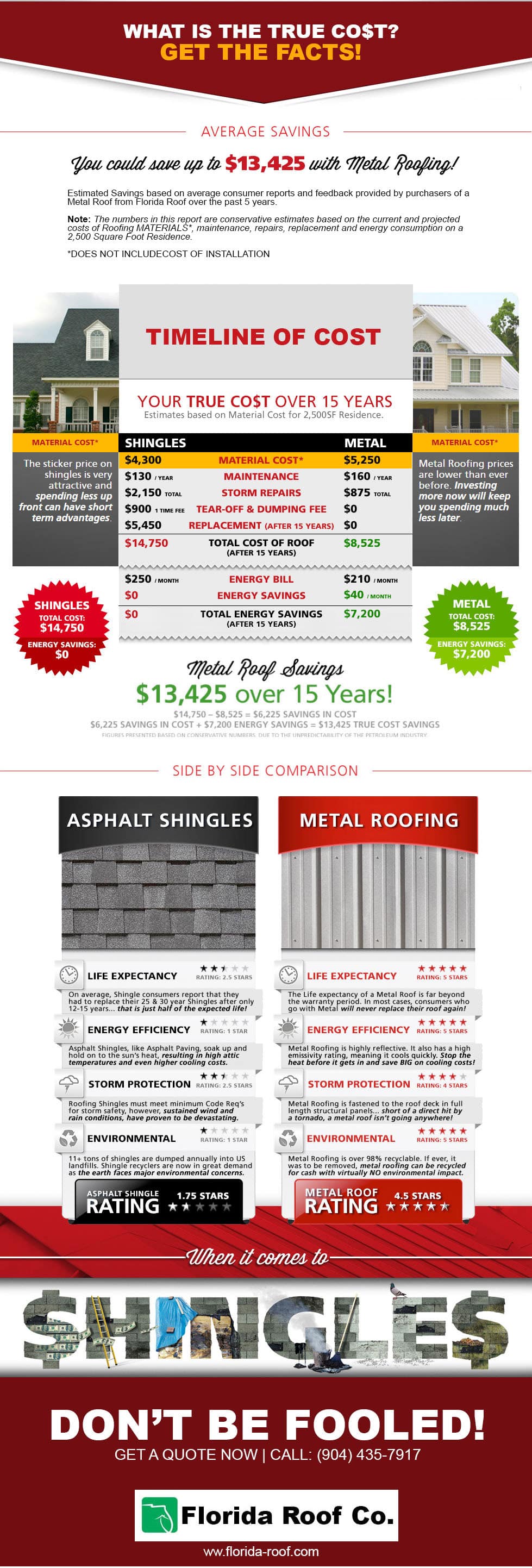 We install every type of roof at Florida Roof Company, however we recommend metal roofs for a variety of reasons. This graphic below will help you see the benefits of metal roofing over shingle roofing, especially in The Jacksonville FL and North Florida areas.